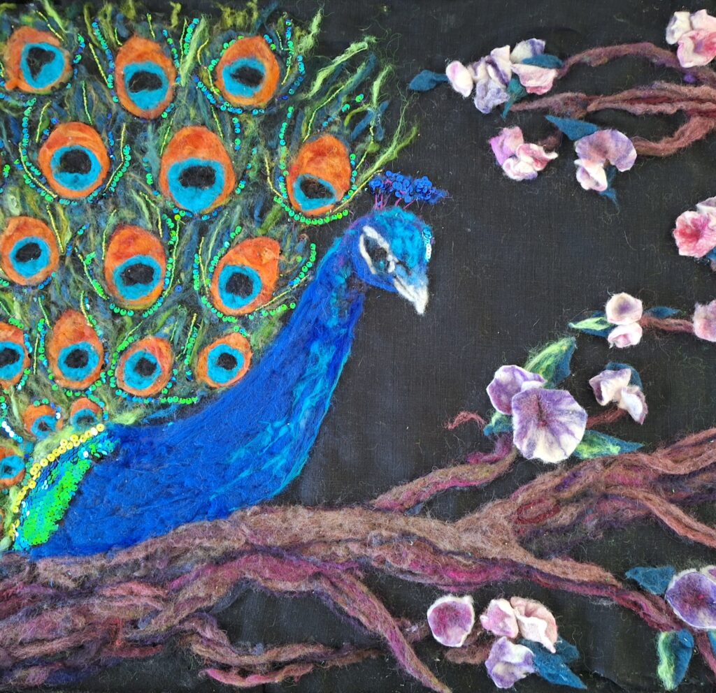 Peacock Bloom, 22×32″ wool needle felted on linen with sea beads and sequins. Flower wet felted then needle felted. $1500.